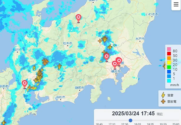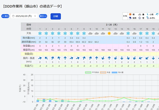 登録地点の降水量や積雪、落雷、熱中症指数、風向風速などの気象データを1年以上前まで遡って確認可能。