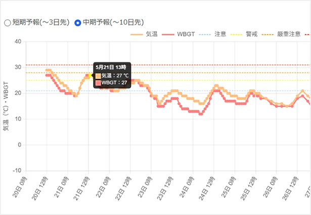 WBGT(暑さ指数)のアラートと気象情報をもとに熱中症リスクを事前に把握。