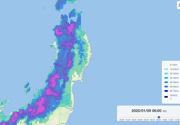 1時間ごとの降雪予測に加え、解析に基づく過去の積雪深も提供。
