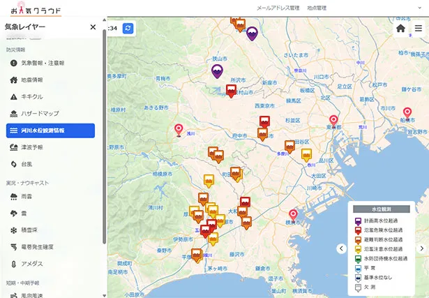 (テレメータ&危機管理型水位計による)全国15,000か所の河川水位を10分ごとに更新。